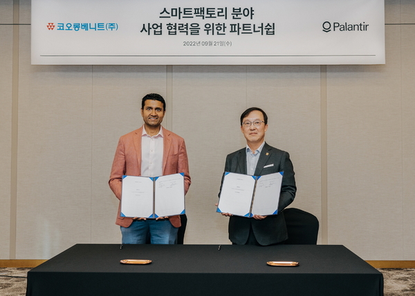 ▲ 이진용 코오롱베니트 대표이사(우측)와 샴 샹카(Shyam Sankar) 팔란티어 최고운영책임자(좌측)가 ‘스마트팩토리 사업 협력을 위한 파트너십’을 체결하고 기념 사진을 촬영하고 있다.코오롱그룹 IT서비스 전문기업 코오롱베니트가 지난 21일 글로벌 빅데이터 기업 팔란티어 테크놀로지스(Palantir Technologies, 이하 ‘팔란티어’)와 스마트팩토리 분야 사업 협력을 위한 파트너십을 체결했다.