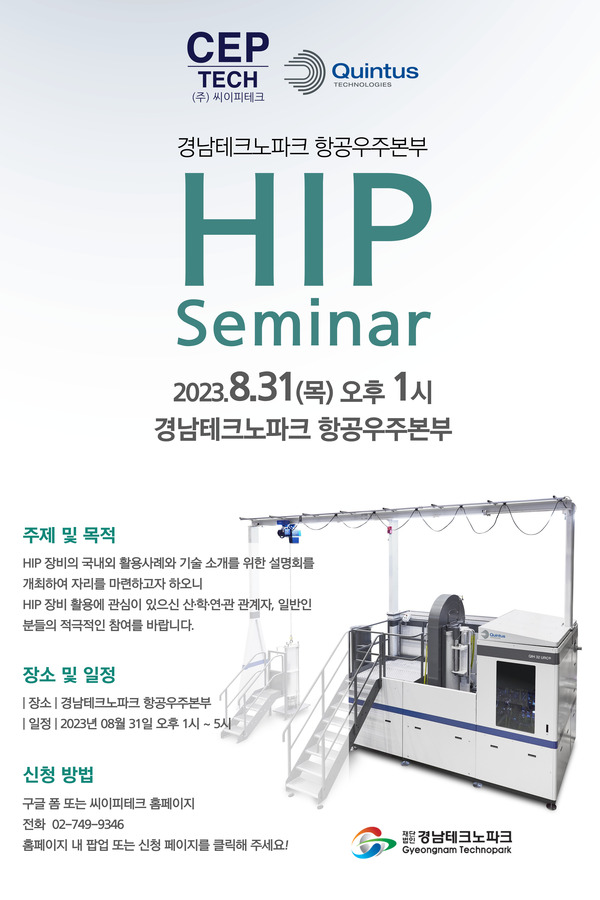 씨이피테크(CEP TECH)와 퀸투스 테크놀로지스(Quintus Technologies)가 경남테크노파크 항공우주본부와 함께 오는 8월 31일 오후 1시 경남테크노파크 항공우주본부에서 ‘HIP(Hot Isostatic Pressing, 열간 등압 성형) 세미나 코리아 2023’을 개최한다.