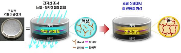 ▲ 전자선을 이용한 겔형 리튬이온 배터리 제조 과정겔형 리튬이온 배터리는 휴대폰, 전기차 등에서 사용되던 액체 전해질 리튬이온 배터리에 비해 폭발 위험성을 줄일 수 있는 대안으로 주목받아왔지만, 기술적 어려움으로 상용화에 한계가 있었다.