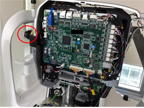 ▲ 안과용 망막진단장비(OCT)에 장착된 표준 안구팬텀(빨간색 원 표시)