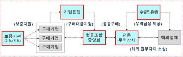 원부자재 공동수입 지원은 국내에서만 시행되던 공동구매제도를 중기중앙회, 수은, 기은, 기․신보, 전문무역상사가 협업해 수입까지 확대하는 것으로, 공동구매를 통해 중소기업 수입 원부자재의 수입 단가를 낮추고, 공동구매 전용보증을 활용해 참여 기업의 구매대금을 보증한다.