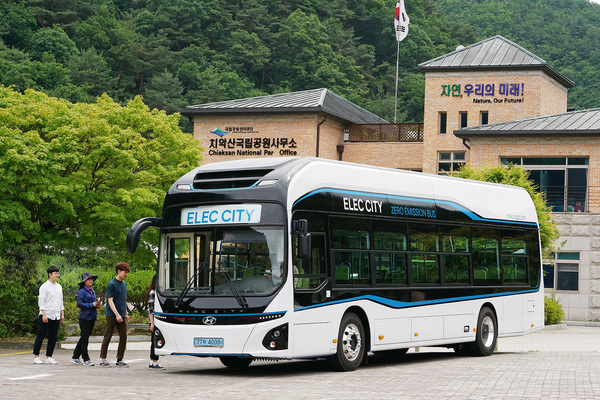 ▲ 전국 4개 국립공원에서 1달간씩 순차적으로 관광객 셔틀버스로 시범 운영되는 현대자동차 친환경 전기버스 ‘일렉시티’현대자동차는 국립공원관리공단과 6월 28일 전기버스 일렉시티 시범 운영에 관한 MOU를 체결했으며, 이를 통해 올해 6월부터 11월까지 전국 4개 국립공원에서 친환경 전기버스 일렉시티를 관광객 셔틀버스로 시범 운행을 시작한다고 밝혔다.