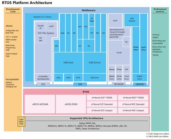 ‘eT-Kernel(이티-커넬)’은 실시간 운영체제 플랫폼으로, 멀티코어 에디션은 자동차 기기나 모바일 기기처럼 고성능 임베디드 시스템이 요구되는 분야에 이상적으로 적용될 수 있다. 또한 이와 관련된 미들웨어 제품군으로는 파일시스템인 PrFILE2, 네트워크 프로토콜인 PrCONNEST/Pro, USB 옵션 와이파이 드라이버 등이 있으며 서드파티 제품군으로는 ARM, DiSTI, UIE JAPAN 등이 있다.