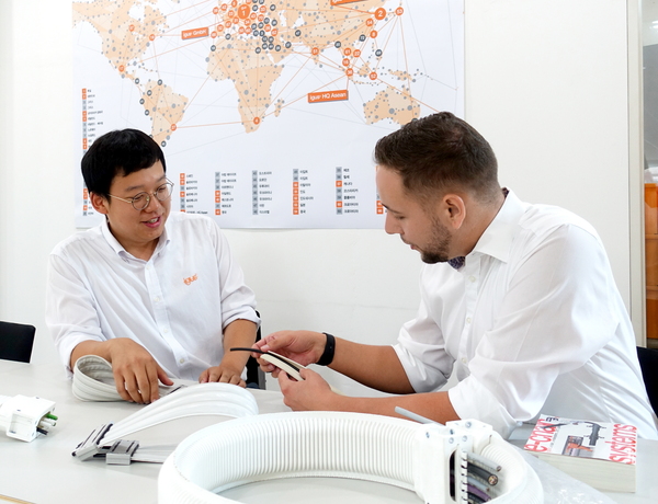 ▲ 왼쪽부터 e스킨 플랫 샘플 회의를 갖고 있는 정준희 과장과 이구스 클린룸 산업 HQ 담당자 Peter Mattonet이구스(igus)가 클린룸 체인, e스킨 플랫을 새롭게 개발했다. 이구스가 2016년부터 공략해 오고 있는 클린룸 체인의 초기 모델은 밀폐형 주름 튜브 e스킨으로 길이 조절이나 유지보수를 현장에서 해결할 수 있다는 장점을 가지고 있다.