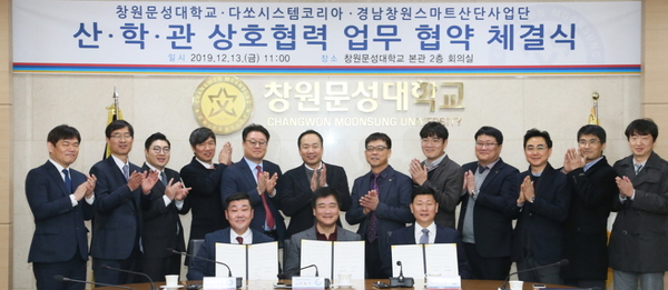 ▲ 다쏘시스템이 13일 창원문성대학교, 경남창원스마트산단 사업단과 3D 팩토리 플랫폼 구축 및 운영을 통한 제조 기업의 스마트 제조혁신 가속화를 위한 상호협력 업무협약서(MOU)를 체결했다.다쏘시스템이 13일 창원문성대학교, 경남창원스마트산단 사업단과 3D 팩토리 플랫폼 구축 및 운영을 통한 제조 기업의 스마트 제조혁신 가속화를 위한 상호협력 업무협약서(MOU)를 체결했다. 다쏘시스템은 창원문성대학교와 공동 투자를 통해 교육 프로그램을 개발하여 3D 전문 인력을 양성하여 배출한다는 방침이다.